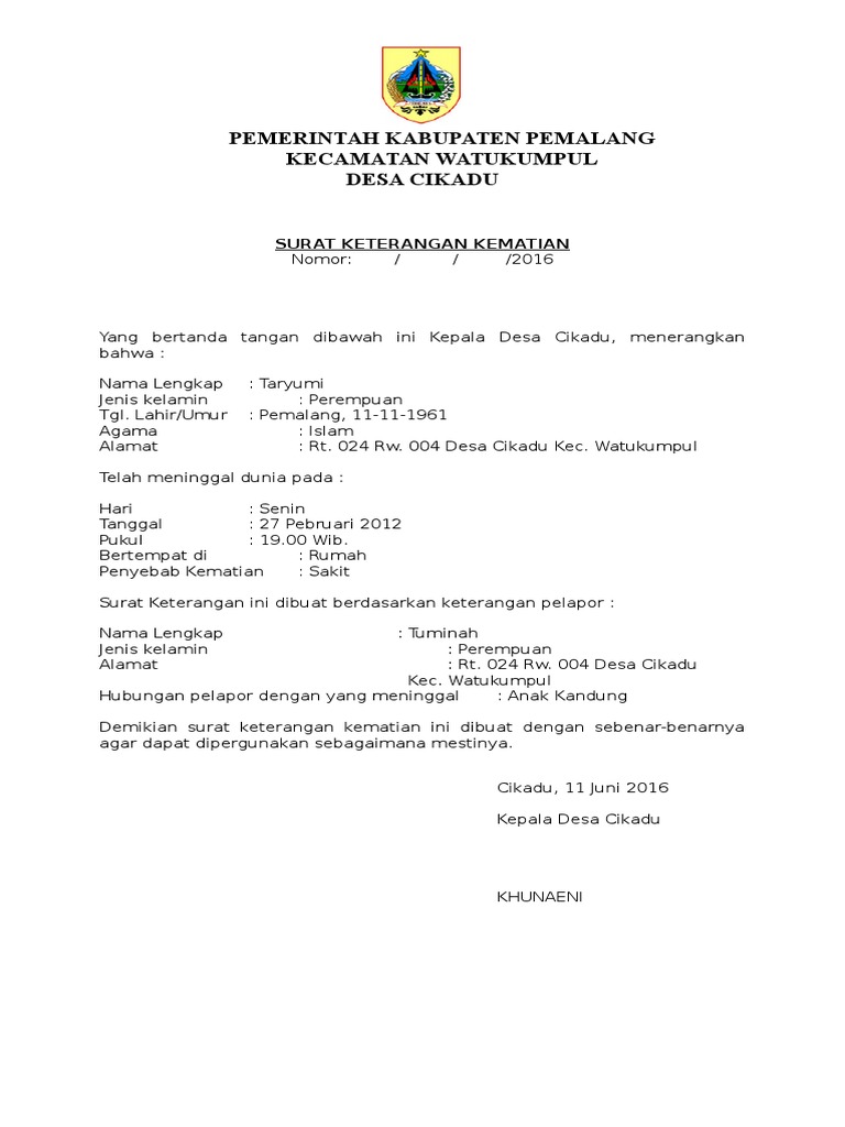 Contoh Surat Keterangan Kematian Dari Rt Rw - Surat Keterangan Kematian Dari Rt Rw - Rukun tetangga (rt) perumahan muria indah rw 014